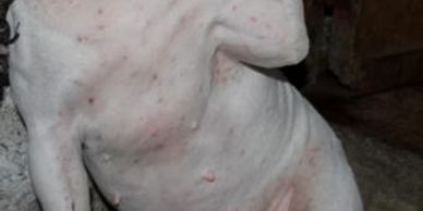 Ichthyosis is a skin disorder that can be found in the American Bulldog. The pup in the picture above was produced at Eagle's Wing Kennels before any commercial genetic testing for Ichthyosis was available. Signs that a pup is affected by the disorder are apparent within the first couple of weeks following birth. The skin appears "dirty" and won't wash clean, and the fur takes on a wrinkled appearance. Beware the breeder who doesn't know what Ichthyosis is or tries to pass off a skin condition in a young pup that looks like this as "normal." The University of Pennsylvania isolated the gene with help of biopsies from the 2 affected puppies in this litter, and developed a test that is commercially available from U of P, as well as included in many DNA profiles offered commercially, including the Embark and Wisdom. While not a life threatening disease, it can be uncomfortable for the dog and a nuisance for the owner due to excessive scaling, itching and dander production.